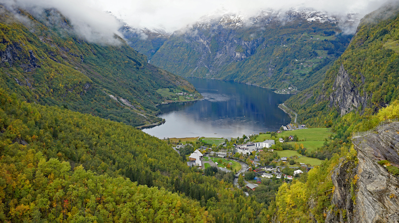 Flydalsjuvet byr på imponerande utsikt over bygda Geiranger og Geirangerfjorden med alle cruisebåtene. Juvet er omkranset av høye fjell og et fantastisk fotopunkt - et must når man er i Geiranger!