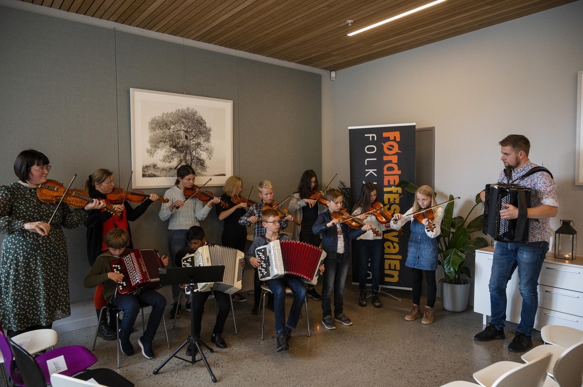 Dansemusikken i kveld er det ungdommen i Sunnfjord juniorspelemannslag og Lerkefalk som står for.