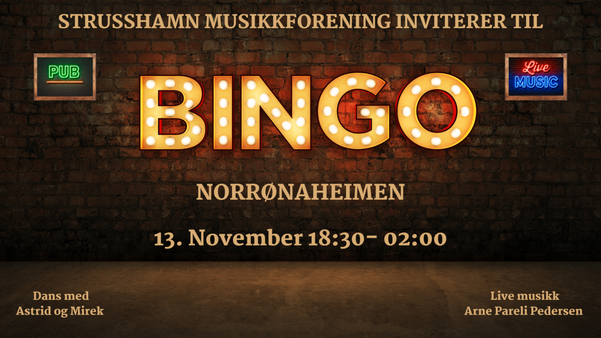 Strusshamn Musikkforening inviterer til god gammeldags pub bingo 13. November fra kl.18:30- 02:00. Det blir en forrykende kveld, med live musikk fra Arne Pareli etterfulgt av Astrid og Mirek som...