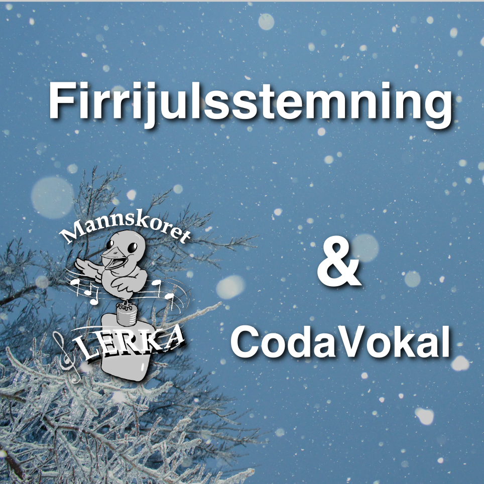 Mannskoret Lerka inviterer til firrijulsstemning i Orkdal kirke søndag den 26. november. I år er vi heldige og har fått med oss CodaVokal som gjester. Konsertstart klokken: 16:00 og 19:00.