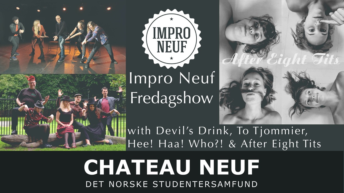 Impro Neuf er stolt å presenterer IMPRO NEUF FREDAGSHOW🎭🙌💥 Noen av Impro Neuf's erfarne improteam skaper humor basert på dine forslag. Superteams er: □ After eight tits □ Hee! Haa! Who?! □...