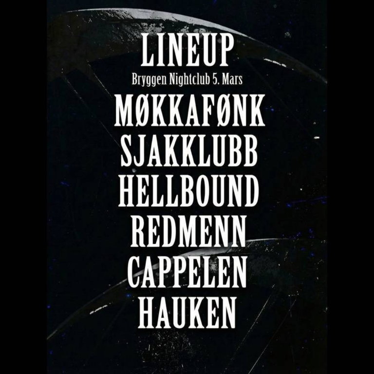 FERRAGAMO slipper konsept 5. mars, på bryggen nigthclub Lineup: SJAKKLUBB MØKKAFØNK CAPPELEN REDMENN SANGER: Hjemmesnekk x hauken Partysnekk x hauken pissesnekk x hauken