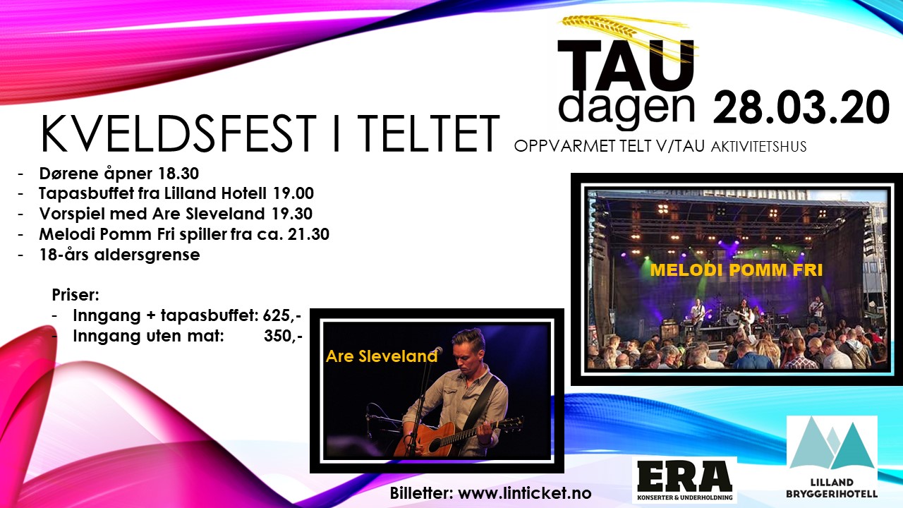 ERA Konserter inviterer sammen med Lilland hotell til kveldsfest i teltet etter Taudagen lørdag 28.03.20. Det blir servert mat (Tapas-buffèt) kl 19, konsert med Are Sleveland fra ca 19:30 og det...