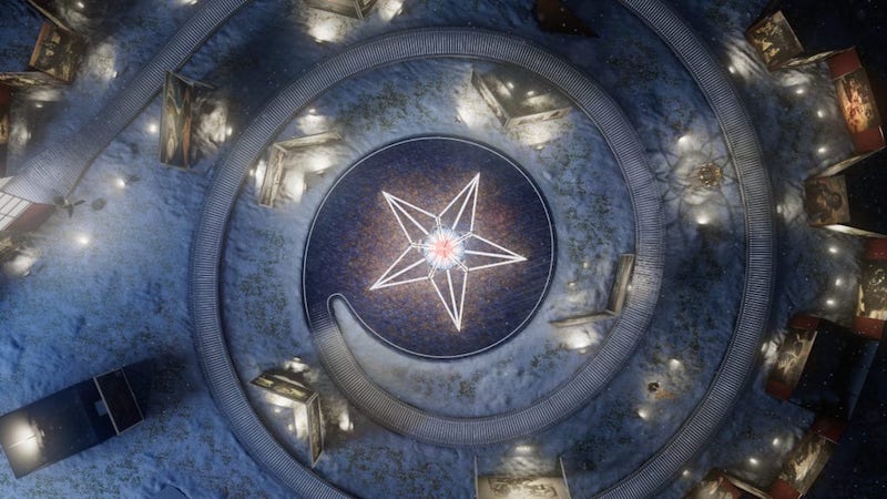 Vi fortsetter på en tre-bro på 275 meter med lys og musikk under som krøller seg som en spiral inn mot De ufødtes stjerne i midten; en geometrisk lysende skulptur som skal minne oss om det frie menneske og at vi alle er knyttet sammen, også de kommende generasjonene. Her kan man høre Verdenserklæringen om menneskerettighetene. Roseslottet har okkupasjonen som et bakteppe, men handler først og fremst om de fantastiske verdiene våre om frihet og menneskeverd – det som peker fremover. Rundt oss høres fuglene fra skogen. Bildene skifter, det ene sterkere enn det andre med referanser til Munch, Pollock, Kate Kollewitch og Francis Bacon. Vebjørn smiler.