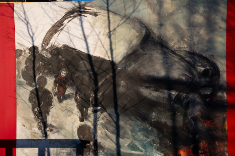 Vi nærmer oss scenen og en spektakulær utsikt over Oslofjorden, der Donau kjørte utover med jødene for 78 år siden, og med direkte linje til Honnørbrygga der Kong Haakon ankom juni 1945. På fire bilder ser vi lille Ellinor i rød kåpe, ned landgangen fra Donau med bestemoren Rosa og bamsen og kofferten. Hun og Rosa myrdes dagen etter. Et bilde viser en haug med klær og sko, malt i gråtoner, med Ellinors røde kåpe; et sitat til Schindlers liste.